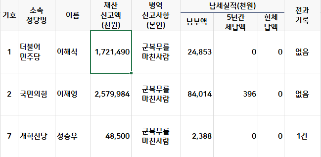 재산, 병역 세금, 전과 관련 사항